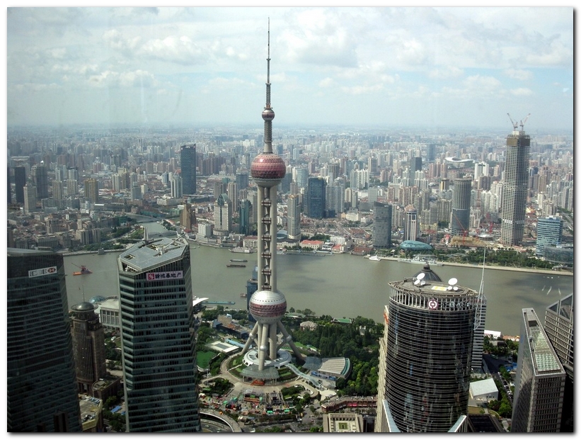 Blick vom 88. Stockwerk des Jin Mao Towers. Der Oriental Pearl Tower.